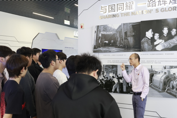 首先,同学们参观上海电机厂企业展示中心,瞻仰毛主席坐像,观看模型、实物、音像资料等,人力资源部副部长过一斌深入讲解上海电机厂的辉煌历史和精神谱系、中国电机工业从“跟跑”到“领跑”的奋斗历程以及“首创精神”“扁担电机”精神的来源与内涵。同学们认真聆听,上海电机厂的辉煌成就让同学们惊叹不已,也深刻体会到了企业坚持匠心铸就、持续创新赋能的精神,他们深受鼓舞,更加坚定了努力学习专业知识、为中国制造业发展贡献力量的决心。