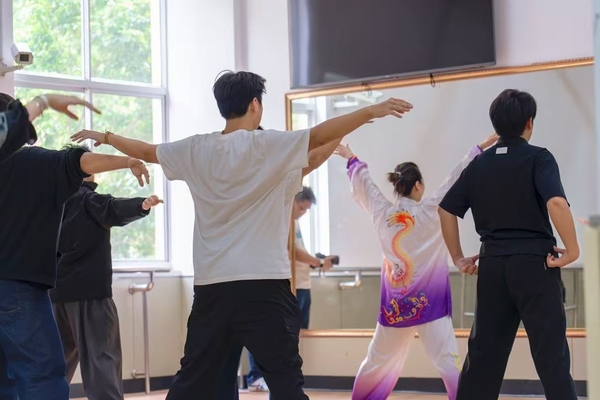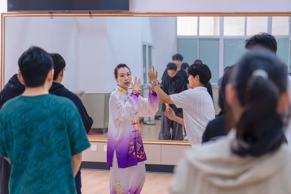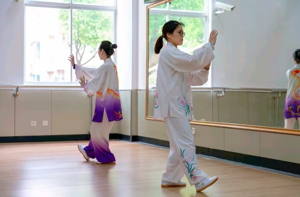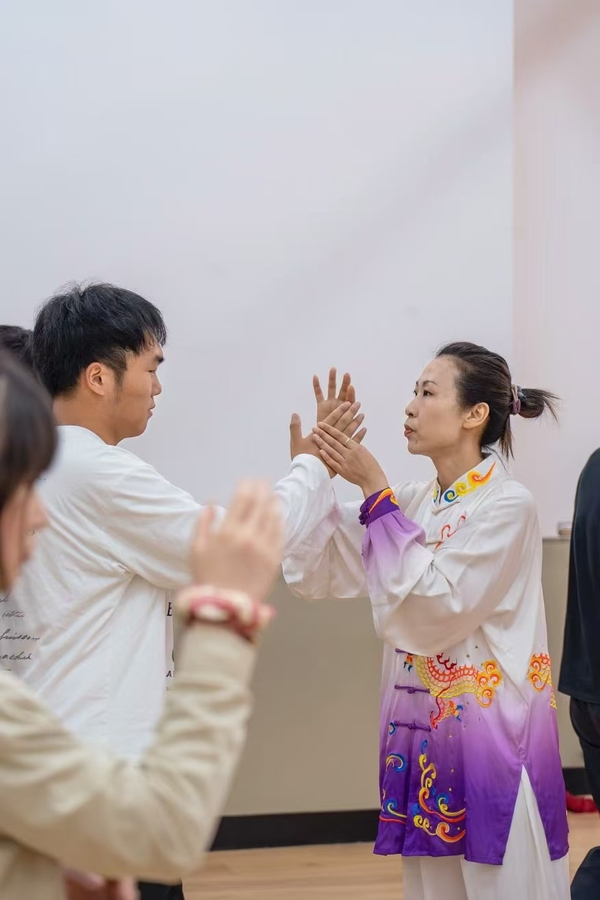 在实践环节,两位老师分组进行手把手教学,带领同学们学习“云手”“马步桩”“白鹤亮翅”等经典招式。体会气息流转,感受动静结合同时,锻炼下盘力量,培养定力与耐力。