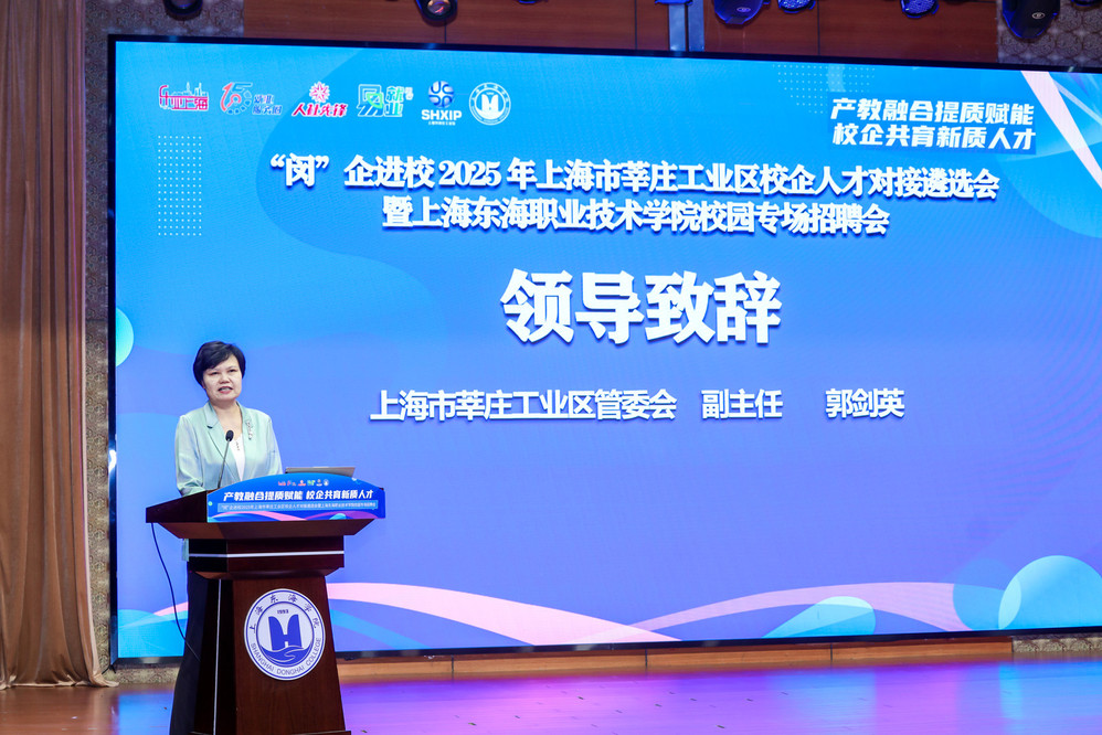 活动伊始,通过校企合作共建成果视频回顾,展现了东海学院与莘庄工业区企业在智能制造、工程技术等领域的协同育人成果。莘庄工业区管委会副主任郭剑英在讲话中详细阐述了工业区的人才战略布局,作为全市首批市级工业园区,莘庄工业区不再满足于“制造工厂”的标签,而是全力向“智能智造生态圈”转型。“东海模式”是成功的起点,但绝不是终点在莘庄工业区,每一颗螺丝钉的转动,都在参与时代的进程,而青年学子的加入,将让这份“制造”升华为“智造”。