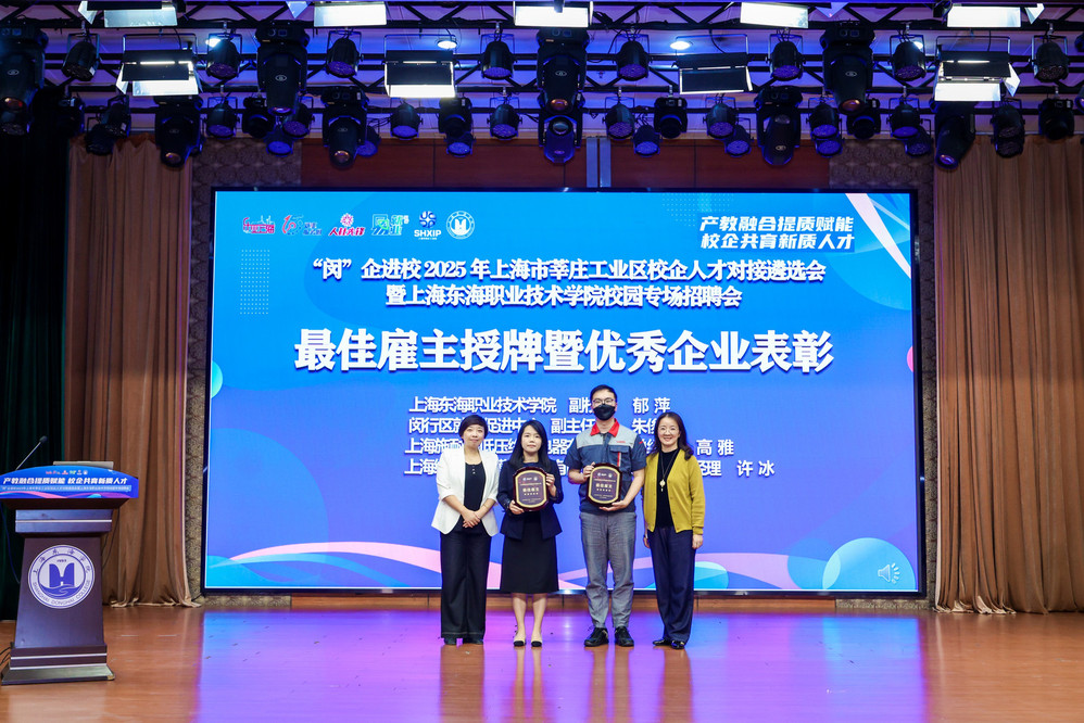 随后,副校长郁萍表彰优质企业并为“最佳雇主单位”授牌。学校与莘庄工业区通过动态评估企业人才需求匹配度,对在“精准引才育才”中表现突出的企业授予称号,以强化示范效应。施耐德维科精密企业获评“最佳雇主”,彰显了区域企业对学校人才培养的高度重视与深度投入。