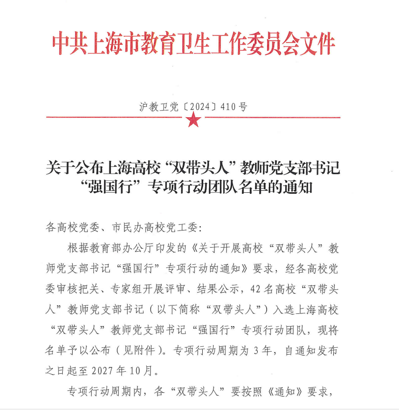 近日,市教卫工作党委公布了上海高校“双带头人”教师党支部书记“强国行”专项行动团队名单,我校申报的马克思主义学院党支部成功入选上海高校“双带头人”教师党支部书记“强国行”专项行动团队。
