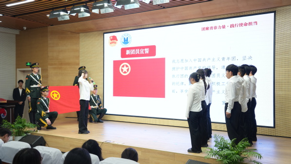 随后,新团员代表在优秀团员的带领下进行了入团宣誓。新团员们庄严宣誓,表达了加入团组织的自豪感和责任感,承诺将铭记入团初心,坚定理想信念,为实现中国式现代化贡献青春力量。