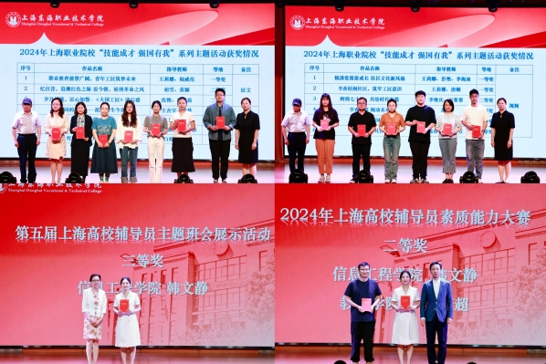 校领导、职能部门负责人为“技能成才 强国有我”系列活动、第五届上海高校辅导员主题班会展示活动、上海市辅导员素质能力大赛等获奖团队及个人颁奖。机电学院辅导员团队改编歌曲《卷就一个字》以幽默诙谐的歌词展现辅导员工作的酸甜苦辣,传递“以生为本”的坚守与情怀。获奖代表韩文静、高雅楠分享育人心得,用亲身经历诠释“为党育人、为国育才”的初心使命。