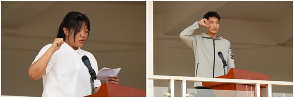运动员代表周宸名同学与裁判员代表贾骐丞老师依次登台,分别代表全体运动员和裁判员在主席台上庄严宣誓。
