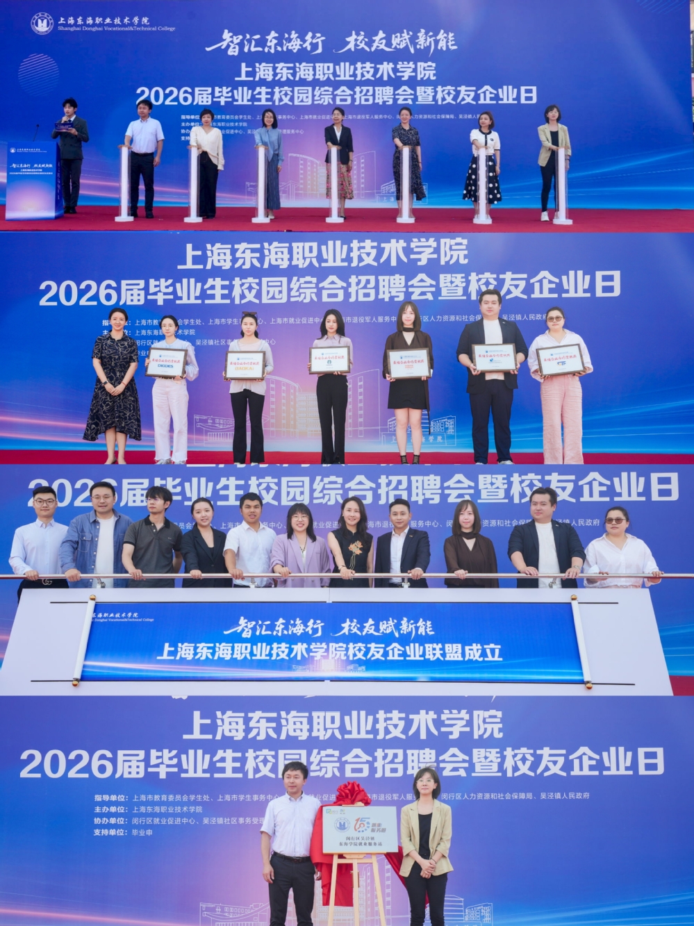 本次招聘会得到上海市教委学生处、上海市学生事务中心、上海市就业促进中心、上海市退役军人服务中心、闵行区人社局、吴泾镇等单位联合指导。学校始终将毕业生就业工作作为重中之重,此次招聘会通过“政府搭台、校企联动、校友反哺”模式,整合多方资源,为毕业生拓宽就业渠道。学校领导、市就业促进中心及吴泾镇领导、企业代表及校友嘉宾共同出席活动。上海市就业促进中心相关负责人对学校就业服务工作给予高度评价,现场解读了最新就业创业政策。学校与吴泾镇政府携手打通就业服务最后一公里,上海市闵行区吴泾镇“15分钟就业服务圈”东海学院就业服务站正式揭牌,这是闵行区落成的首个高校嵌入式就业站点。活动同期举办了校友企业沙龙,表彰了一批在校企合作中作出突出贡献的企业并授牌。学校与现场多家企业达成了就业实习基地建设、定向培养等领域合作。