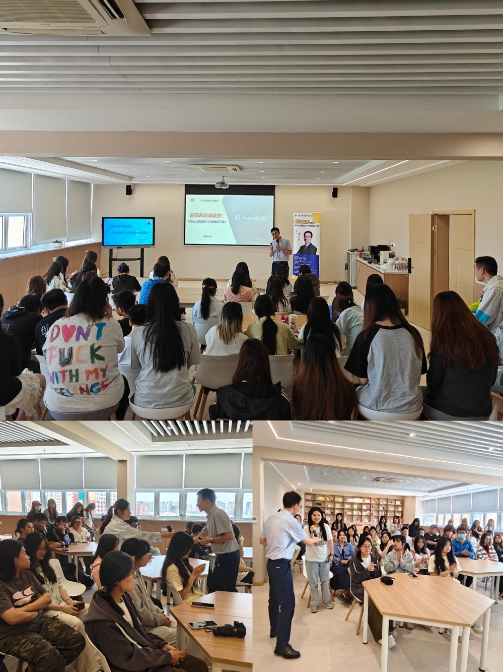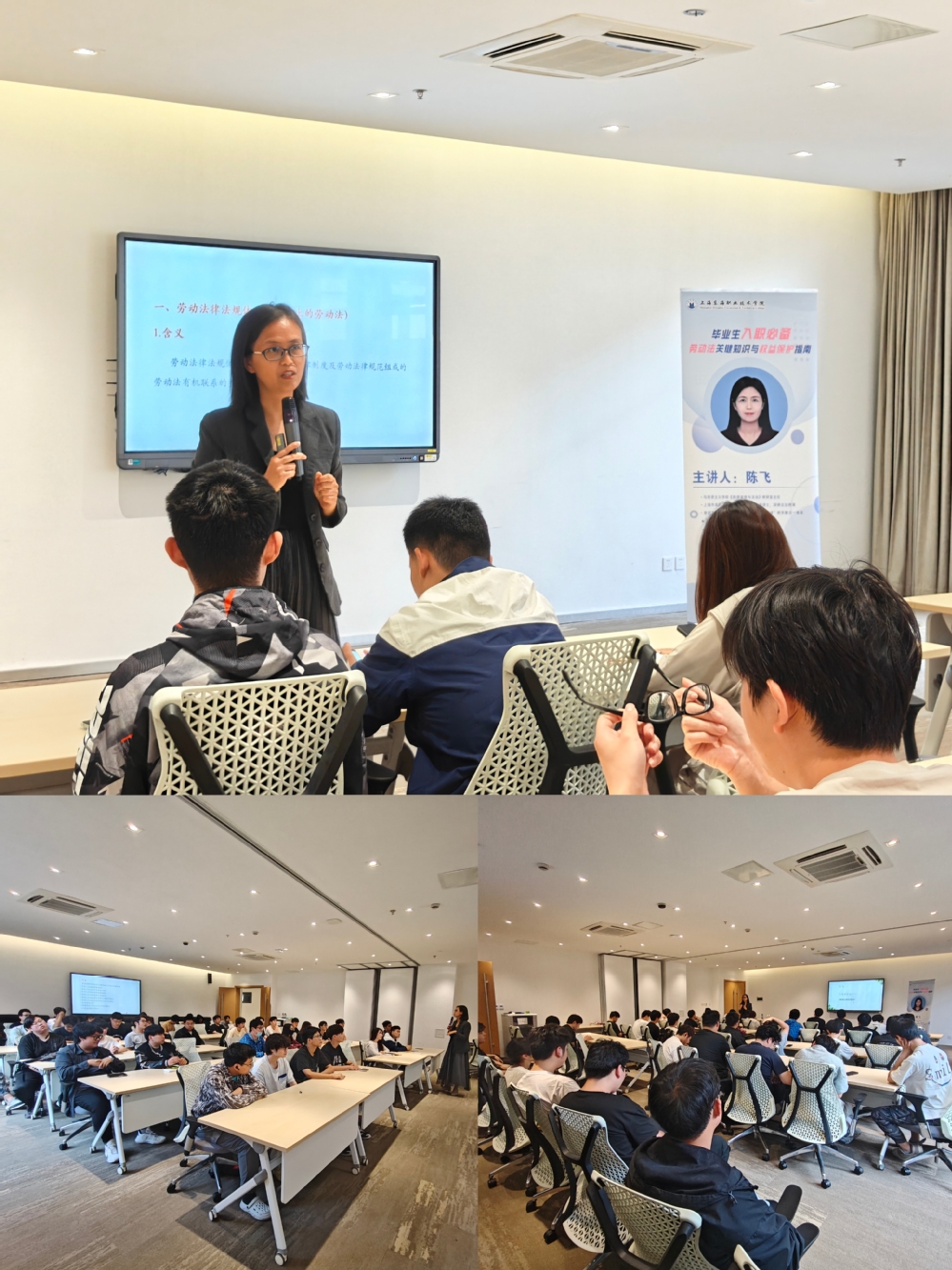 查乐宏老师围绕毕业生初入职场常见的心理挑战,如角色落差、社交恐惧、工作倦怠等,通过案例解析与互动答疑,帮助学生掌握心理调适方法,快速适应职场环境,共同破解传统就业指导精准度不足的难题。陈飞老师结合学生熟悉的兼职场景,从法定假日、加班工资等热点问题切入,深入解读劳动合同中的试用期权益、加班费计算等关键法律条款,并通过案例分析指导学生规避职场风险。施晓玮提出的“角色×需求×学习=∞可能”职场方程式,系统讲解了职场与大学的差异、职场法则、职业核心诉求及终身学习的重要性,为毕业生提供了清晰的职业发展路径指导。