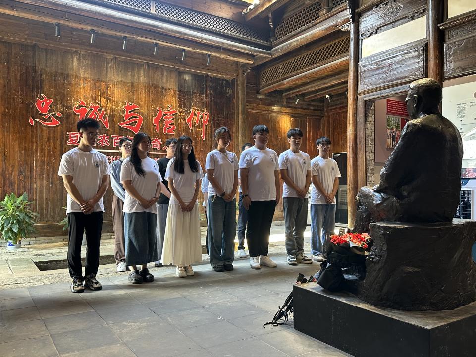 仪式伊始,在庄严肃穆的氛围中,喻佳美与东海学院师生代表肃立于夏征农同志铜像前默哀致敬,并依次敬献鲜花。随后,在讲解员引导下,全体人员参观了事迹馆各展区,通过珍贵影像资料深入了解夏征农同志为革命事业奋斗的光辉一生。
