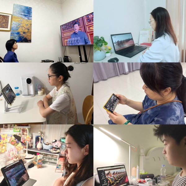 无论是在会议室还是家中,师生们都聚精会神地守候在屏幕前,满怀激动地观看阅兵盛况。当国旗护卫队迈着铿锵有力的步伐护卫五星红旗进场时,师生们自发起立,神情庄重,齐声高唱国歌,现场氛围庄严而热烈。受阅部队整齐划一的队列、现代化武器装备的震撼登场、空中梯队呼啸而过的英姿,全面展现出新时代中国军队的强军风貌和国家实力的日益强盛,引来师生阵阵赞叹和由衷自豪。