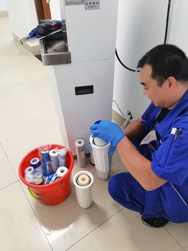 更换滤芯、清洗管道、检测水质,确保饮水设备安全运行,保障师生饮用水安全。