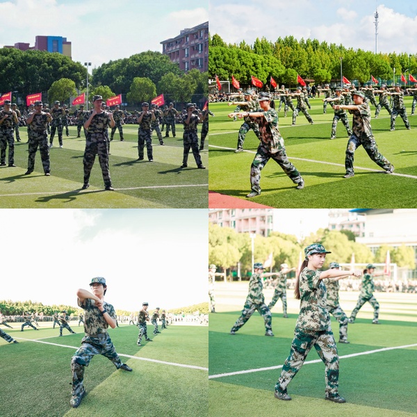 军训会操不只是动作展示,更是集体荣誉的鲜活注脚与精神凝聚。新生们迈开的每一步都诠释着对自己、对集体的责任。队列展示环节,嘹亮的口号响彻体育场上空,瞬间点燃现场氛围。从精神抖擞的出场队列,到短促有力的整齐报数,新生们身姿挺拔、眼神坚定,每一个细节都展现出严谨的纪律意识;从干净利落的整理着装,到动作精准的停止间转法,手臂摆动的角度、转身的速度分毫不差,将数日训练的成果展现得淋漓尽致;从规范标准的敬礼礼毕,到协调一致的行进立定,步伐的节奏与摆臂的幅度高度统一,形成一道道整齐划一的绿色风景线。军体拳方阵的表演将汇演推向高潮,拳法刚劲有力,喊声气势如虹,一招一式尽显东海学子的蓬勃朝气,展现了学子们团结协作、奋发向上的精神风貌。