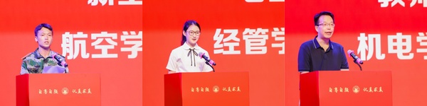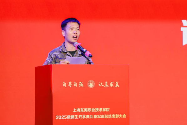 新生代表航空学院高志名、学长代表经管学院徐婉琪两位同学分别在典礼上发言。高志名是一名退伍军人,他代表全体新生发言时表示,军训是一场身体与精神的双重洗礼。烈日下的军姿、靶场上的战术、疲惫中的相互扶持,让他们深刻领悟了纪律的重量与集体的温暖。他郑重承诺,定将把军训收获内化于心、外化于行:以“出门看队列”的严谨律己,成为文明先锋;以“进门看内务”的细致治学,争当学业表率;更将胸怀家国,砥砺坚韧品格,努力成长为校歌所寄望的国之栋梁。徐婉琪以其获得2025年世界职业院校技能大赛“财经赛道”金奖的经历,用“脚下的路、肩上的担、心中的光”勾勒出大学的奋斗图景。她寄语学弟学妹:以每日的勤勉去走好“脚下的路”,为未来奠基;以知行合一的担当去扛起“肩上的担”,为青春铸魂;最终点亮“心中的光”,以专业与热血服务社会,努力成长为有理想、有本领、有担当的时代新人。