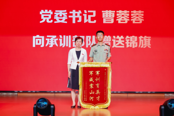 在热烈的掌声中,党委书记曹蓉蓉代表全校师生向承训部队赠送锦旗,对承训官兵们付出的辛勤汗水与展现的优良作风致以崇高敬意和衷心感谢。