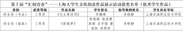 近日,第十届“汇创青春”——上海大学生文化创意作品展示活动获奖名单正式公布,上海东海职业技术学院教育学院学子表现优异,共获得综合类(书法)三等奖1项、综合类(插画)三等奖1项,共7名学生在这届上海市高校文创盛事中赢得荣誉。
