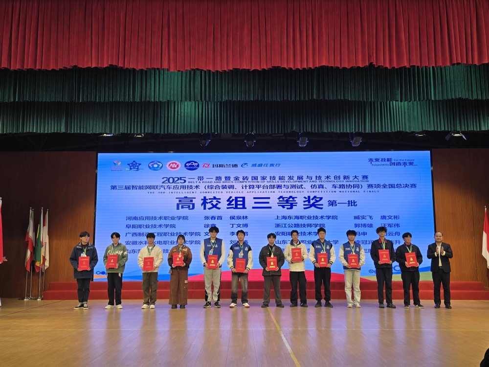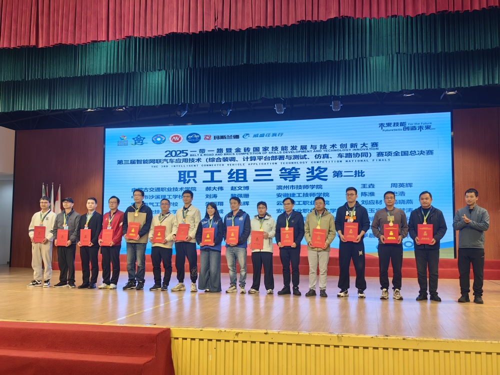 2025一带一路暨金砖国家技能发展与技术创新大赛第三届智能网联汽车应用技术赛项全国总决赛于2025116日至9日在安徽汽车职业技术学院圆满落幕。上海东海职业技术学院机电学院师生组成的参赛队伍凭借扎实的专业功底、默契的团队协作和出色的临场发挥,奋勇拼搏,最终斩获高校学生组二等奖1项、三等奖1项,高校职工组三等奖1项的优异成绩,为学校赢得了荣誉。