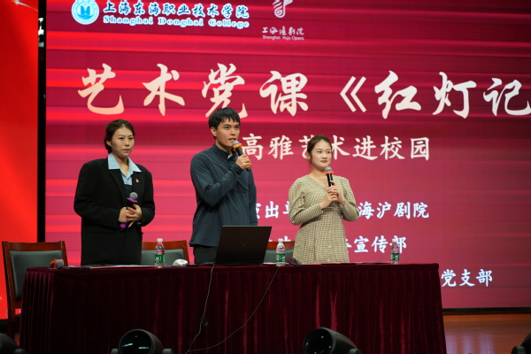 为弘扬中华优秀传统文化,扎实推进我校“戏曲进校园”工作,11月13日,《红灯记》红色文艺党课进校园活动举办。活动特邀上海沪剧院二级演员朱麟飞、丁叶波、王禕雯三位艺术家,以“讲座+表演”的形式,为师生呈现了一场别开生面的红色文化盛宴。