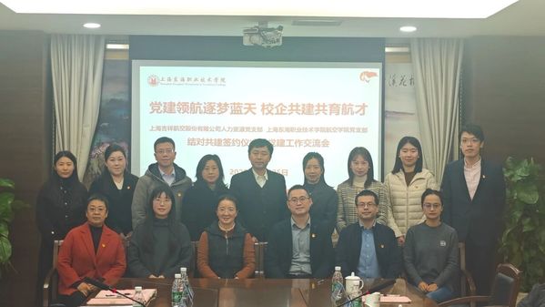 为深入贯彻落实新时代党的建设总要求,以高质量党建引领事业高质量发展,近日,上海东海职业技术学院航空学院党支部与上海吉祥航空股份有限公司人力党支部举行结对共建签约仪式暨党建工作交流会。本次会议以“党建领航逐梦蓝天,校企融合共育民航英才”为主题,旨在通过创新基层党建工作载体,深化产教融合,为新时代民航强国建设提供坚实的人才支撑。会议由航空学院院长周孟华主持。