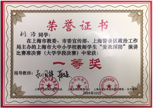12月7日,由上海市教育委员会、中共上海市委宣传部、上海警备区政治工作局联合主办的2025年上海市大学生“爱我国防”演讲比赛决赛圆满落幕。我校优秀退役学生刘浩从众多参赛选手中脱颖而出,荣获一等奖,为学校国防教育工作再添荣誉。