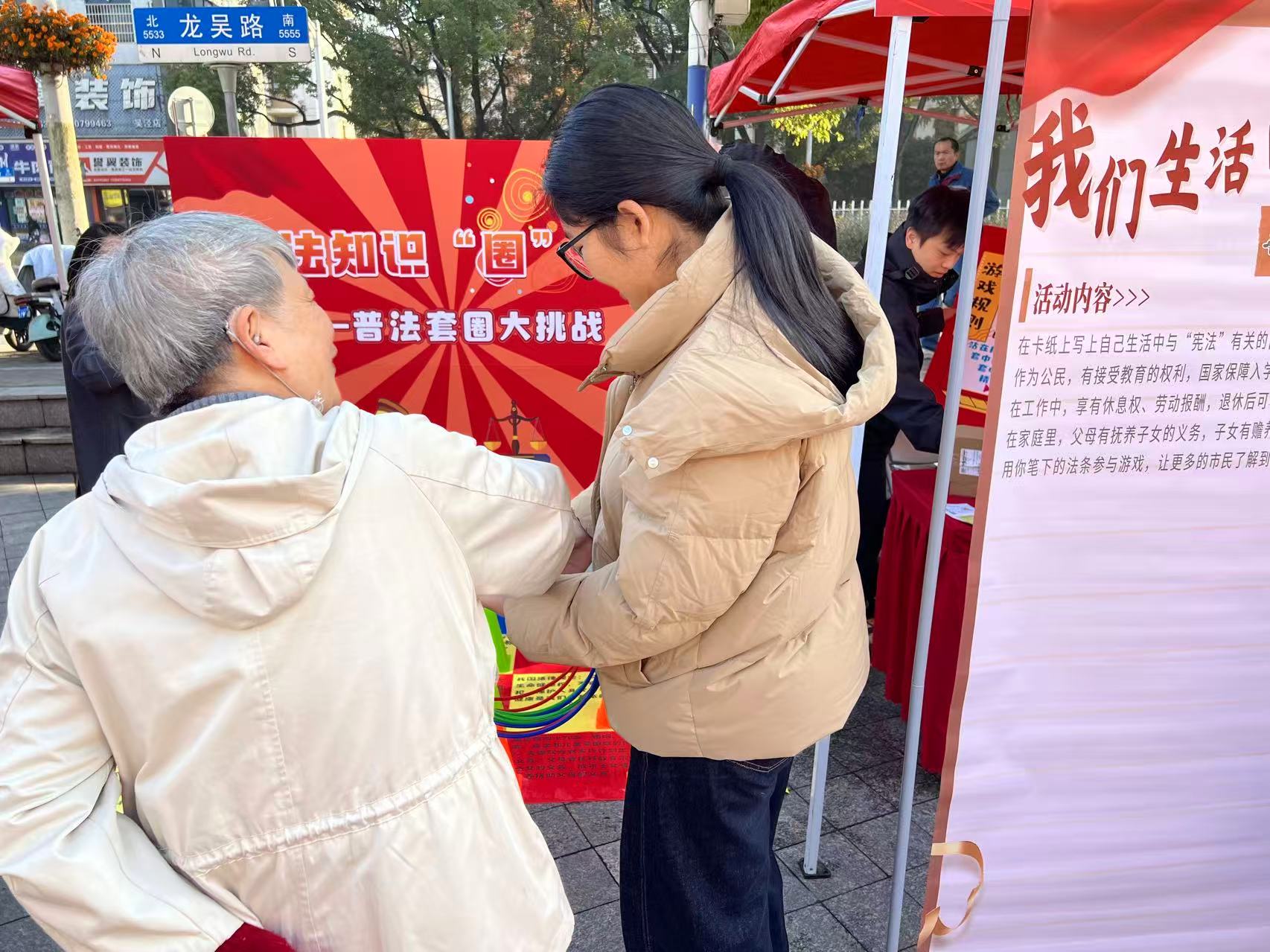 为大力弘扬宪法精神,将法治服务精准送达群众身边,2025年12月6日上午,由闵行区司法局、吴泾镇人民政府联合主办的宪法宣传周暨星期六法律服务早市专场活动,在吴泾镇社区文化活动中心广场热闹启幕。东海学院青年法学社精心策划并开展“宪法知识‘圈’中你——普法套圈大挑战”互动活动,用青春活力为基层宪法宣传注入新动能。