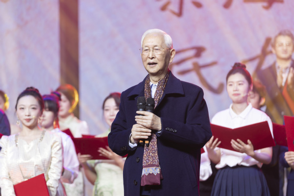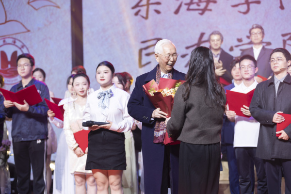 演出落幕后,“东方英才计划”教师项目入选者刘舒叶教授作为教师代表向学校理事长、初创者曹助我敬献鲜花,以表对教育前辈的敬意与感谢。曹助我对本次演出的成功表示热烈祝贺,并向全体演职人员和付出辛勤努力的师生致以衷心感谢。他指出,该剧以艺术形式生动展现了东海学院从无到有、从小到大、从弱到强的发展历程,每一幕都凝聚着创作者的匠心与初心,不仅填补了我校校园话剧的空白,更展现了学校的办学成果及东海学子昂扬向上的精神风貌,是我校文化育人实践的一次重要突破。希望创作团队能持续打磨剧本、精进艺术表达,推动这部校园话剧走出校园、迈向更广阔的平台,让更多观众感受到作品中的精神力量与艺术价值。曹助我表示,东海学院建校三十二年来,始终坚持立德树人根本任务,已累计培养近四万名优秀人才,教育教学成果丰硕。他寄语同学们,继续在校训精神的引领下,努力成长为有理想、有本领、有担当的新时代青年。