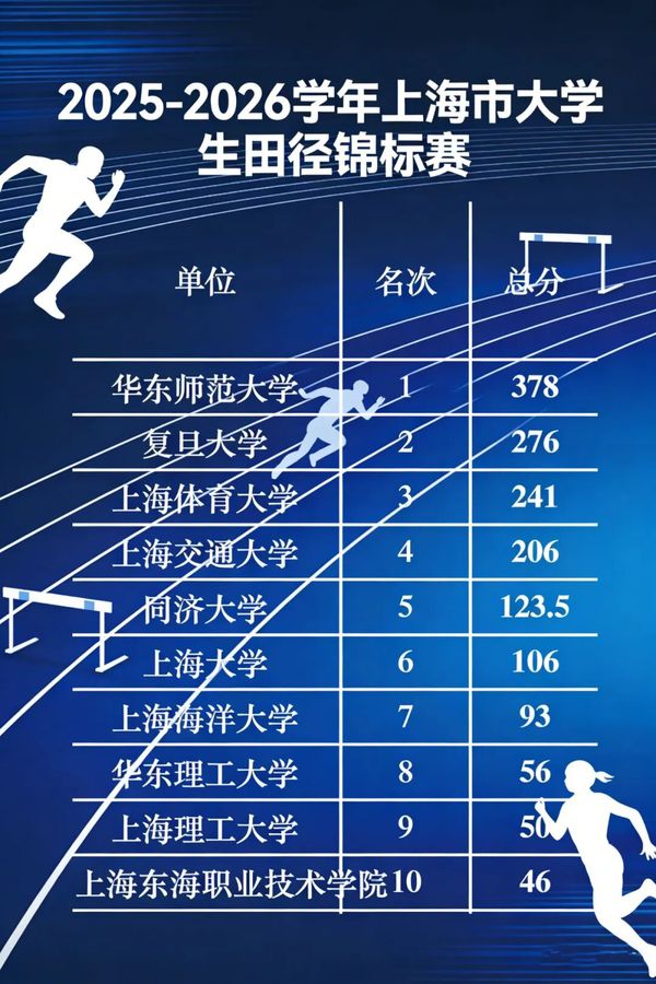 冰霜燃热血,青春正飞扬。2025年12月13日至14日,上海市大学生田径锦标赛在华东师范大学田径场举行。本次比赛汇聚了沪上四十余所高校的田径精英,竞争激烈。东海学院代表队发扬顽强拼搏、奋勇争先的精神,在赛场上展现出卓越的运动风采与竞技水平,最终斩获1金2银1铜的优异成绩。学校是此次大赛中团体总分进入全市高校十佳榜单的唯一高职院校。