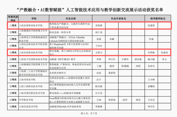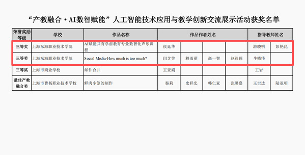 此次获奖不仅是对教师们辛勤付出的肯定,也是东海学院教育学院持续推进教学改革、加强“双师型”教师队伍建设的重要体现。通过参赛,教师们进一步拓展了教学视野,增强了将人工智能、大数据等技术融入教育的信心与能力。学校也将以此次成绩为动力,持续推动人工智能与教育专业的深度融合,优化课程体系、强化实践教学,不断提升人才培养质量,为培养适应数智时代发展的高素质技术技能型教育人才贡献力量。(通讯员 王婷玉)