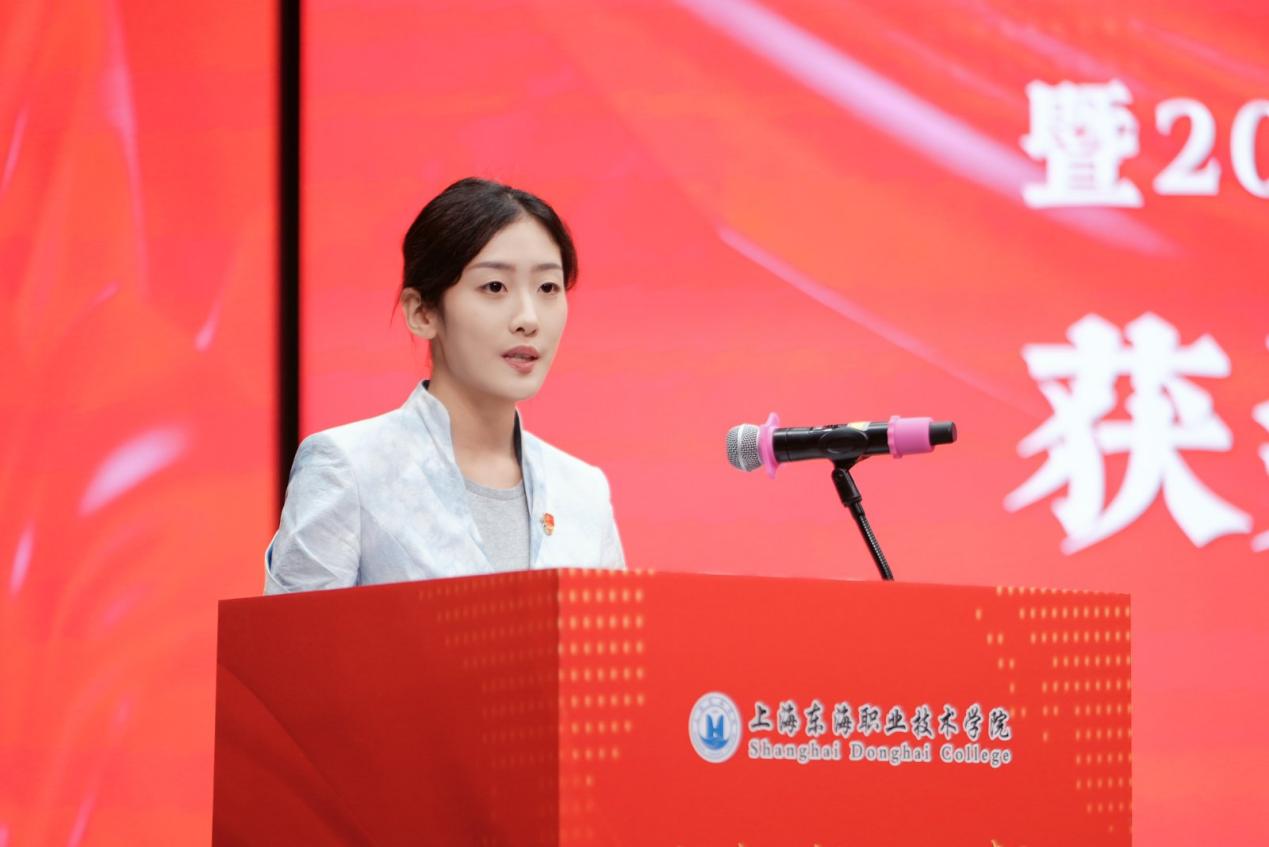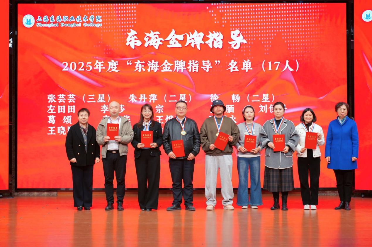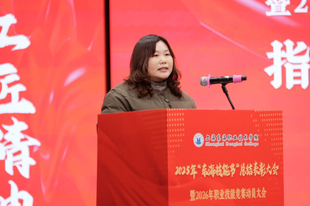 党委书记曹蓉蓉宣读表彰决定。2025年,学校共设立四大类技能大赛荣誉称号,获奖师生达305人次,包括“东海金牌指导”17人、“东海优秀指导”7人、“东海技能之星”50人及“东海技术能手”231人。校党政领导、二级学院院长为获奖师生颁发奖牌、奖杯及荣誉证书。