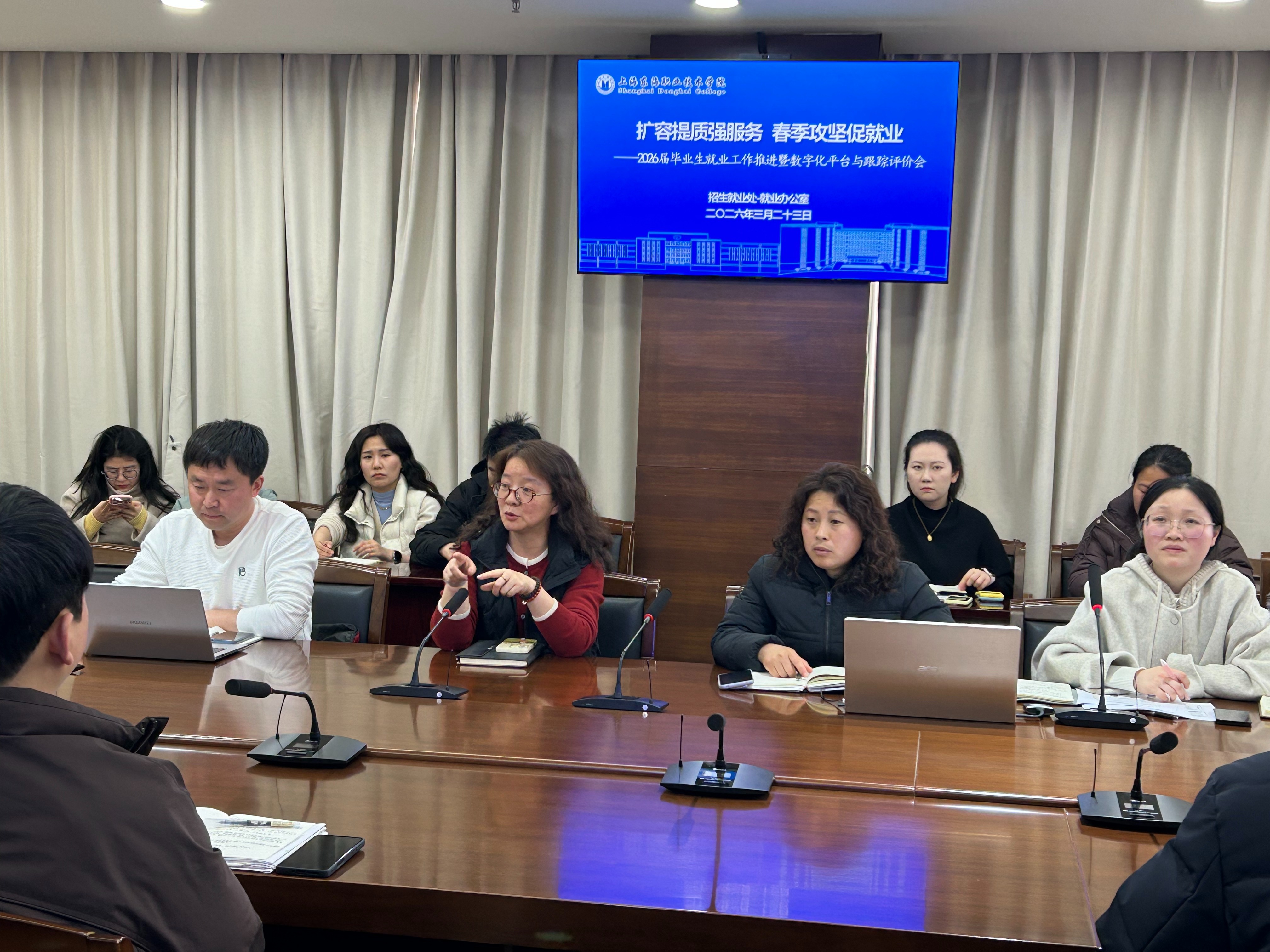 为深入贯彻党中央、国务院关于高校毕业生就业创业工作的决策部署,抢抓春季促就业关键期,并紧密结合学校迎接评估工作,全面总结并系统部署2026届毕业生就业工作,3月23日,我校在东海源南815会议室召开2026届毕业生就业工作推进暨数字化平台与跟踪评价会。副校长郁萍出席会议,各二级学院党支部书记、毕业班辅导员及招生就业处全体工作人员参会。