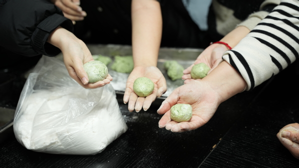 同学们一边听,一边做,一边笑,一边学。糯米粉沾满了双手,脸上却满是认真和喜悦。有同学包得歪歪扭扭,“胖阿姨”笑着接过来,三两下就修整好了:“没事,多练几次就好了。我当年也这样。”有同学包得又快又好,她竖起大拇指:“这个做得漂亮,一看就是用了心。”学生们举着相机,记录下“胖阿姨”的手、揉面的瞬间、同伴认真的表情。“一只手揉青团,另一只手握镜头”——这是传媒学子特有的传承方式。